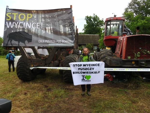 Aktywiści organizacji ekologicznych oraz kilkanaście osób z Czech i Rumunii zablokowało ciężki sprzęt do wycinki drzew, który w ostatnich dniach pracował w cennych przyrodniczo, starych częściach Puszczy Białowieskiej. Rozwinęli bannery z hasłami nawołującymi do zaprzestania wycinki w języku polskim, angielskim i po czesku.